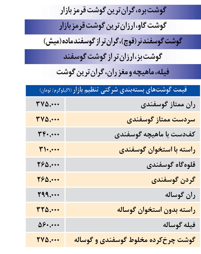 با وجود این، قیمت گوشتهای بستهبندی شرکتی تنظیم بازار که در حال عرضه در فروشگاههای بزرگ و میادین میوه و ترهبار است، بسیار مناسبتر است که در جدول زیر آمده است.