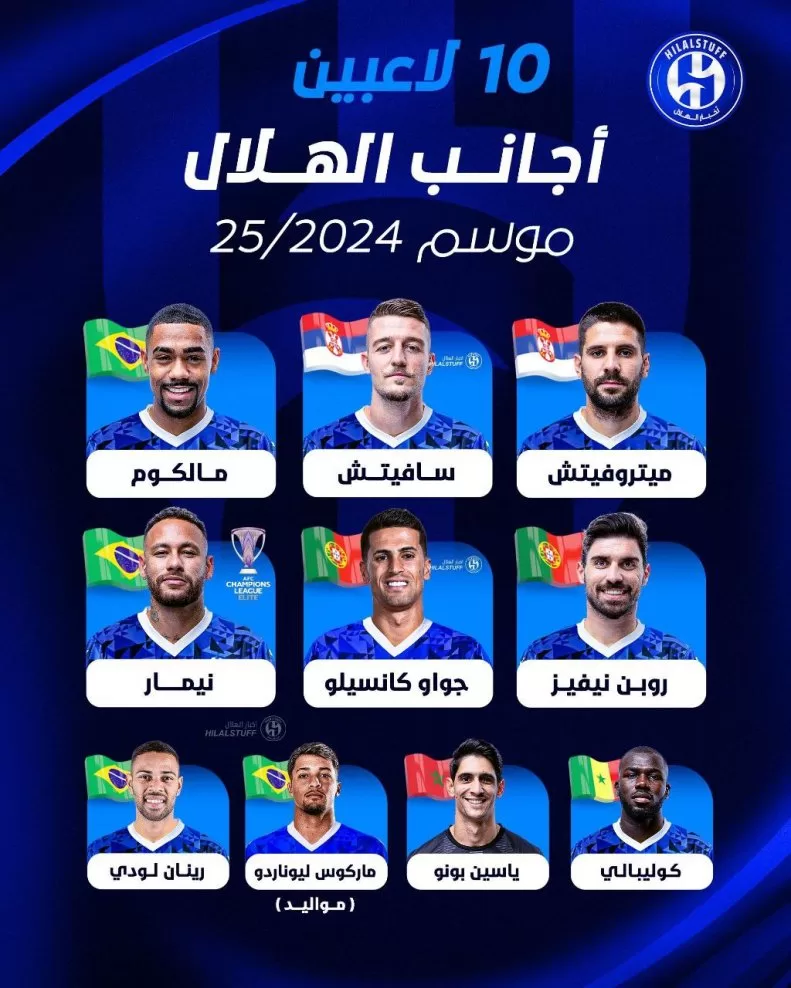 طبق قوانین لیگ عربستان، هر تیم میتواند از هشت بازیکن خارجی با هر سن و سالی و دو بازیکن متولد ۲۰۰۳ به بعد استفاده کند. با حضور نیمار، لیست خارجیهای الهلال به عدد ۹ میرسد که همگی متولد قبل از ۲۰۰۳ هستند. مارکوس لئوناردو تنها سهمیه خارجی زیر ۲۱ سال است و بدین ترتیب جمع ۱۰ خارجی این تیم تکمیل میشود.