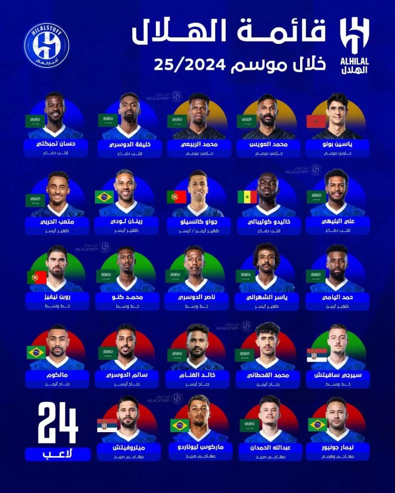 الهلال که با در اختیار داشتن ستارههای پرشمار و نامدار، بخت نخست قهرمانی در اولین دوره لیگ نخبگان به شمار میرود، اسامی ۲۴ بازیکن را برای فصل جدید به ثبت رسانده که نام نیمار، فوق ستاره برزیلی نیز در این فهرست دیده میشود؛ البته فعلا آبیهای ریاض قادر به استفاده از این بازیکن نیستند.