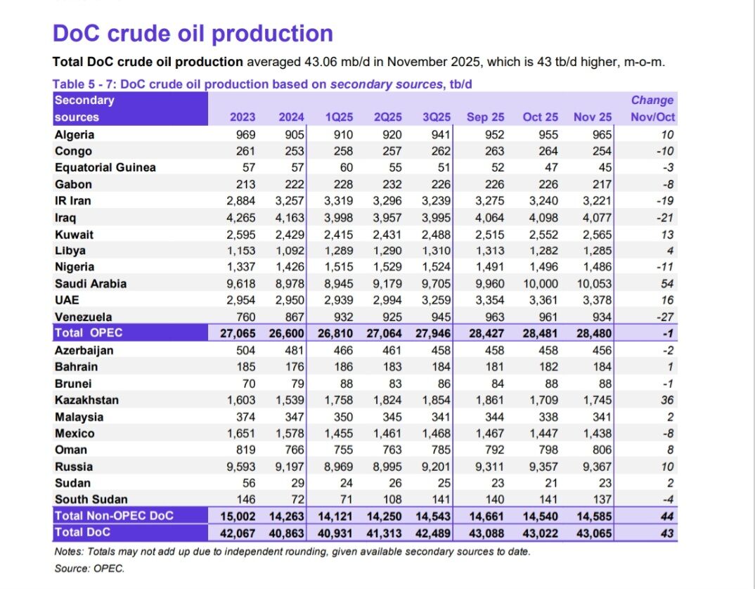 عربستان با تولید روزانه ۱۰ میلیون و ۵۳ هزار بشکه و عراق با تولید روزانه ۴ میلیون و ۷۷ هزار بشکه تولیدکنندگان بزرگ اوپک در ماه نوامبر ۲۰۲۵ هستند.