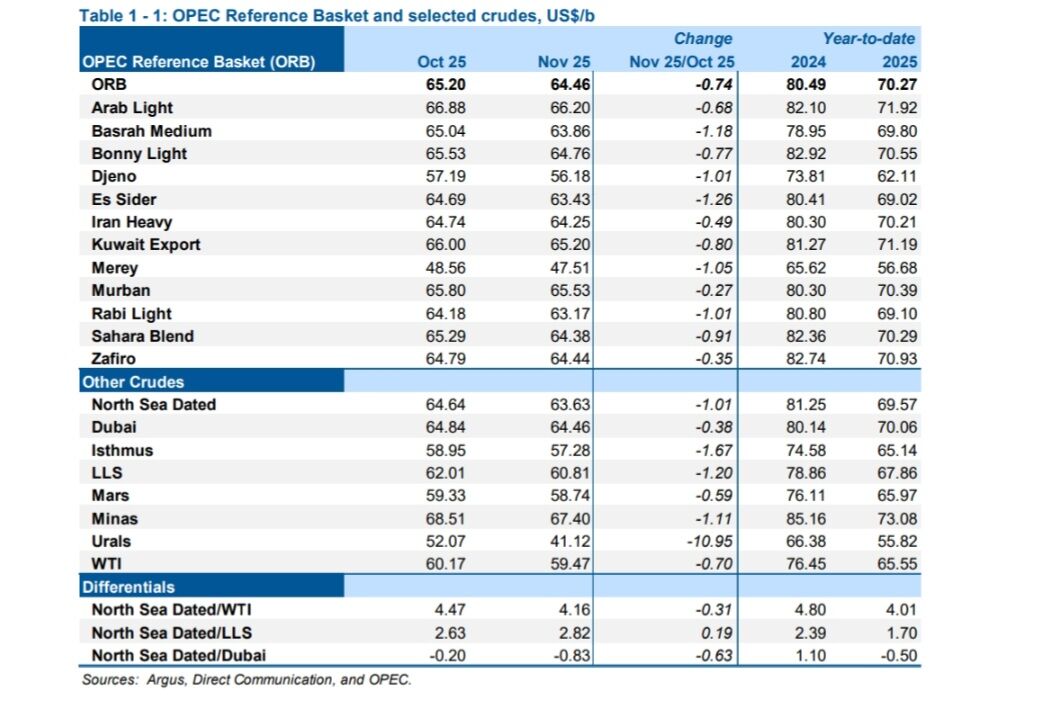 بر اساس تازهترین گزارش ماهانه اوپک، قیمت نفت خام سنگین ایران در ماه نوامبر نسبت به ماه اکتبر، ۴۹ سنت کاهش یافته است. قیمت نفت خام سنگین ایران در ماه نوامبر ۲۰۲۵، ۶۴ دلار و ۲۵ سنت ثبت شد، در حالی که این رقم در ماه اکتبر، ۶۴ دلار و ۷۴سنت برای هر بشکه بود. میانگین قیمت نفت خام سنگین ایران در سال ۲۰۲۴، ۸۰ دلار و ۳۰ سنت بوده است. قیمت سبد نفتی اوپک هم در ماه نوامبر به ۶۴ دلار و ۴۶ سنت برای هر بشکه رسید که این مقدار، ۷۴ سنت کمتر از ماه اکتبر ۲۰۲۵ است.
