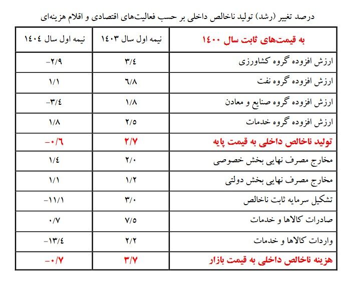 بر اساس گزارش بانک مرکزی، بر اساس برآوردهای اولیه، تولید ناخالص داخلی کشور به قیمت پایه و به قیمت ثابت سال ۱۴۰۰ از ۴۰۲۸۳.۹ هزار میلیارد ریال در ۶ ماهه اول سال ۱۴۰۳ به ۴۰۰۲۴.۱ هزار میلیارد ریال در نیمه نخست سال ۱۴۰۴ کاهش یافته که گویای نرخ رشد تولید ناخالص داخلی به مقدار منفی ۰.۶ درصد در این بازه زمانی است.