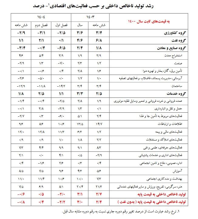 برآورد ارزش افزوده فعالیت‌های مختلف اقتصادی در نیمه نخست سال ۱۴۰۴ نشان می‌دهد که علت اصلی کاهش نرخ رشد تولید ناخالص داخلی را باید در افت ارزش افزوده فعالیت‌های صنعت، ساختمان و کشاورزی، جنگلداری و ماهیگیری جست‌وجو کرد. به‌گونه‌ای که سهم ارزش افزوده هر یک از این فعالیت‌ها در نرخ رشد منفی ۰.۶ درصدی تولید ناخالص داخلی در نیمه اول سال ۱۴۰۴، به‌ترتیب منفی ۰.۷ درصد، منفی ۰.۶ درصد و منفی ۰.۴ درصد برآورد شده است.
