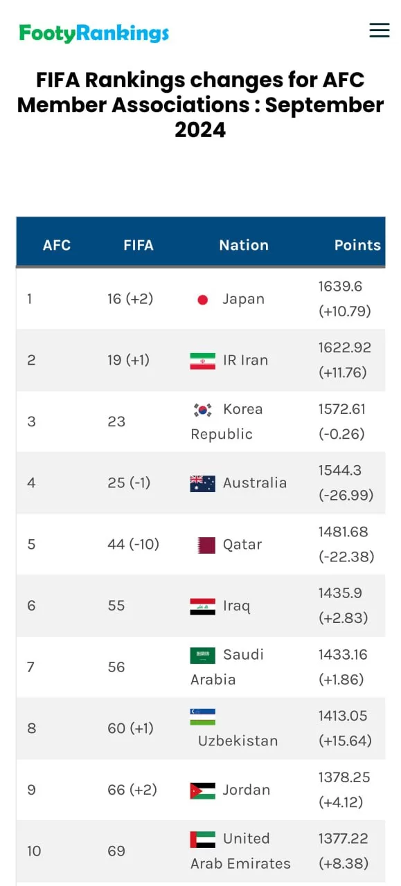 در رتبه بندی تیمهای آسیایی، همچنان رده اول قاره در اختیار ساموراییهاست. ژاپن توانست به لطف دو برد پرگل در فیفا دی اخیر، به رده شانزدهم جهان صعود کند. کره جنوبی و استرالیا همچنان در رده سوم و چهارم آسیا هستند. پس از دو نتیجه فاجعه بار برای قطر و شکست برابر امارات و توقف مقابل کره شمالی، آنها ۱۰ رتبه در رنکینگ فیفا سقوط کردند.