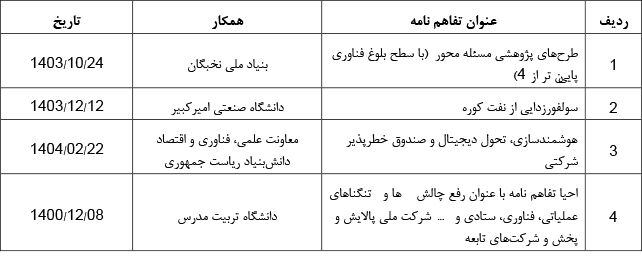 پژوهش و فناوری شرکت ملی پالایش و پخش فرآوردههای نفتی ایران همچنین در بخش همکاریهای علمی، تفاهمنامههایی را در موضوعهای هوشمندسازی، تحول دیجیتال، صندوق خطرپذیر شرکتی و سولفورزدایی از نفتکوره و … با بنیاد ملی نخبگان، معاونت علمی و فناوری ریاستجمهوری و دانشگاههای برتر کشور به امضا رسانده است.