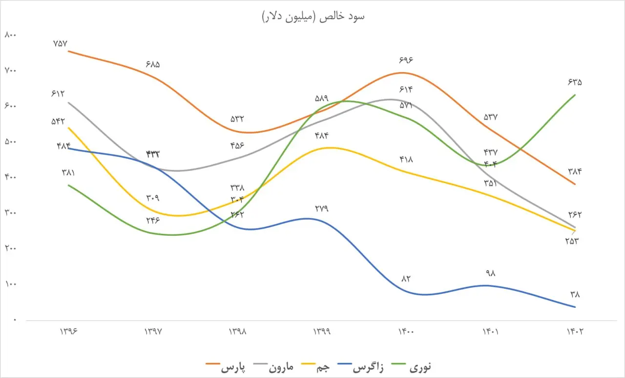 بر اساس این نمودار، بجز نوری که در آن بواسطه افزایش تخفیف سود خالص افزایش یافته بقیه صنعت حال و روز خوبی ندارد. به طوری که برای مثال سود خالص زاگرس در فاصله ۷ سال از رقم ۴۸۴ میلیون دلاری به تنها ۳۸ میلیون دلار رسیده است.
